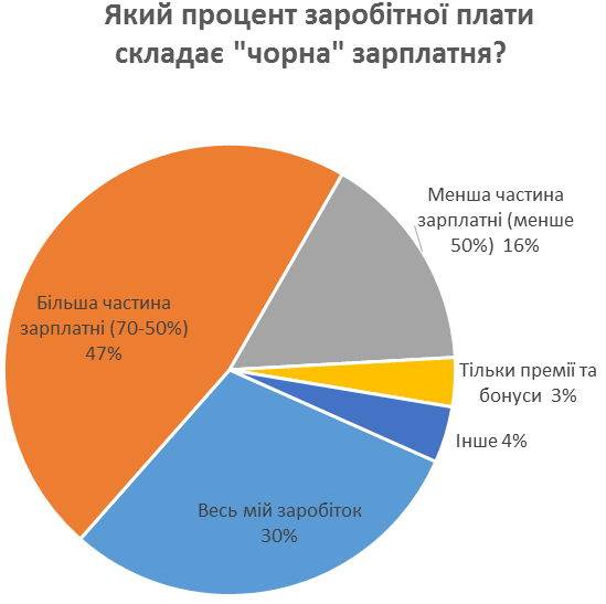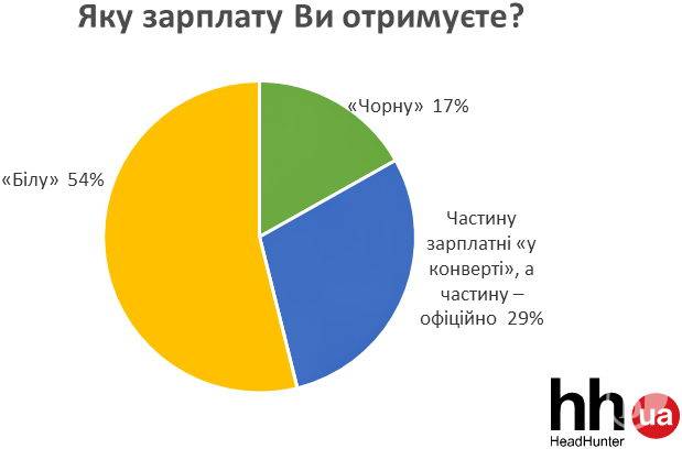 54% респондентів відповіли, що отримують «білу» зарплату. Разом із тим, чималій кількості українців (17%) продовжують виплачувати гроші «у конвертах».