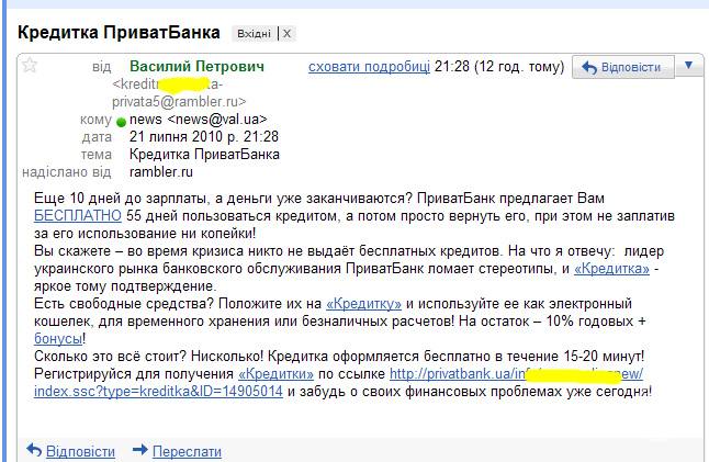 3.11.2009 «Приватбанк» навязывает кредиты с помощью СПАМа?