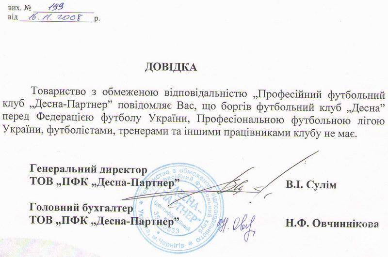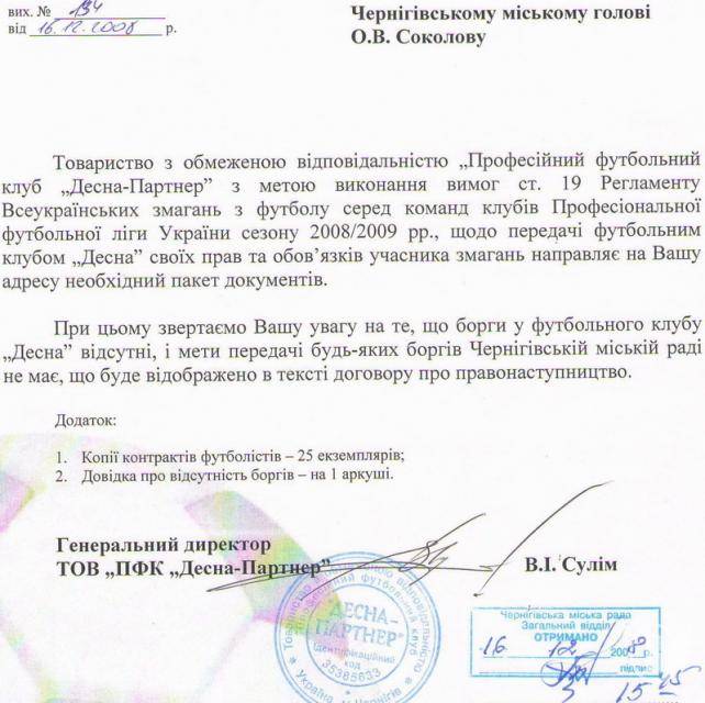 16.12.2008 года ООО „ПФК „Десна-Партнёр” по адресу Черниговского городского председателя направлен пакет документов, который есть исчерпывающим и необходимым для принятия ФК „Десна” Черниговской городской властью. Также ООО „ПФК „Десна-Партнёр” Черниговскому городскому председателю была предоставлена информация относительно отсутствия у ООО „ПФК „Десна-Партнёр” долгов.