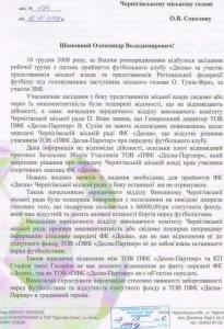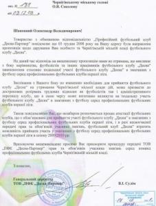10.12.2008 года заместителем городского председателя О.В.Туник-Фриз по адресу ООО „ПФК „Десна-Партнёр” было направлено приглашение на принятие участия в совещании по вопросам принятия ФК „Десна” Черниговской городской властью.