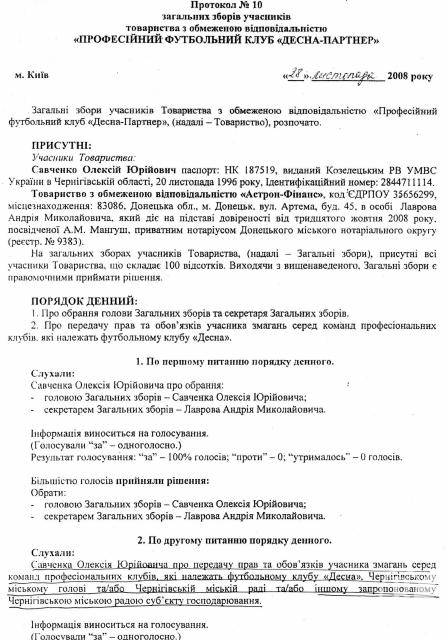 Для подтверждения информации приводим текст Протокола общих собраний участников ООО "ПФЛ "Десна-Партнёр" от 28.11.2008 г., который был предоставлен в пакете документов Черниговскому городскому совету.