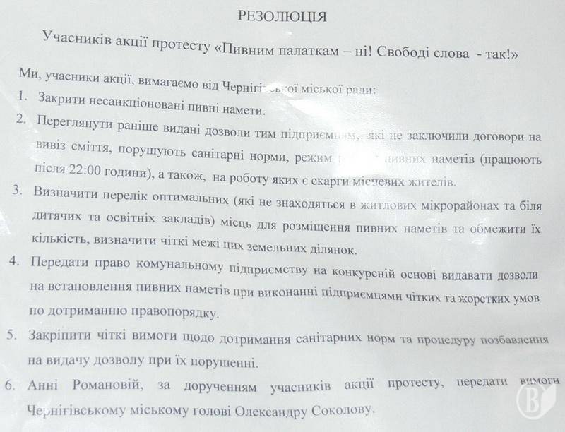 «Громадська думка» підготувала спеціальний лист, який містить всі скарги городян та правила правопорядку, яких повинні дотримуватись власники пивних наметів. Цей лист на ім’я депутата міської ради Віктора Бережного повинен бути зачитаний міському голові Олександру Соколову.