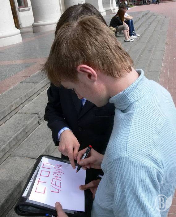 – Сьогодні прийшли ті, хто правильно мислять проти цензури. Журналісти, які займаються мас-медіа, підтримують нас сьогодні по всій Україні. Організатором цієї акції теж є журналіст, досить таки відомий в певних колах… Молодь не хоче, щоб цензура накладалася на ЗМІ, - зазначали присутні на акції молоді люди.