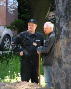 На территории захваченного двора удалось встретить массу знакомых лиц. Юрий Паперный, Дмитрий Зинин. . . А вот и знакомое откормленное лицо мужчины в черной униформе, который сидит под вагончиком застройщика. И знакомо оно мне по точно такой же ситуации в моем дворе.