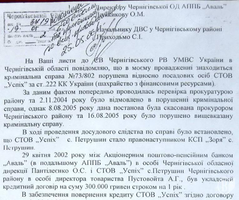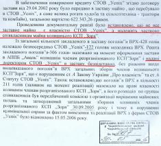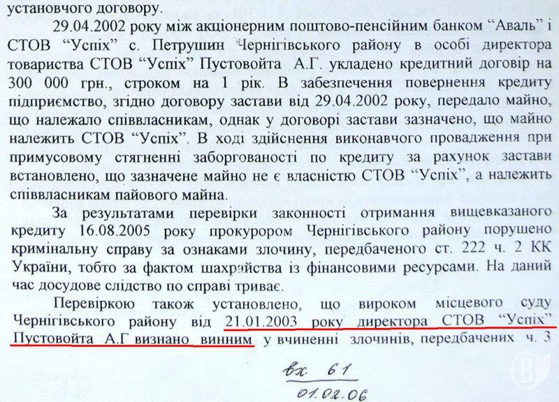 Кредит на 300 тисяч гривень, який взяв колишній голова СТОВ «Успіх» Пустовойт в банку «Аваль», у касу СТОВ не поступав. За даними М.Артеменко, на частину тих грошей була придбана нерухомість у Херсонській області. Де ж поділася решта тих кредитних грошей, йому невідомо.