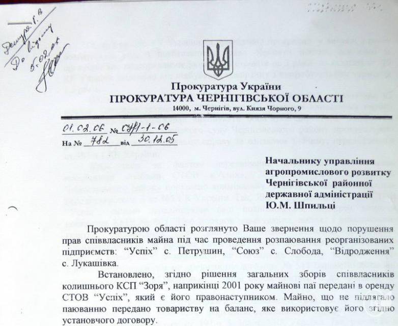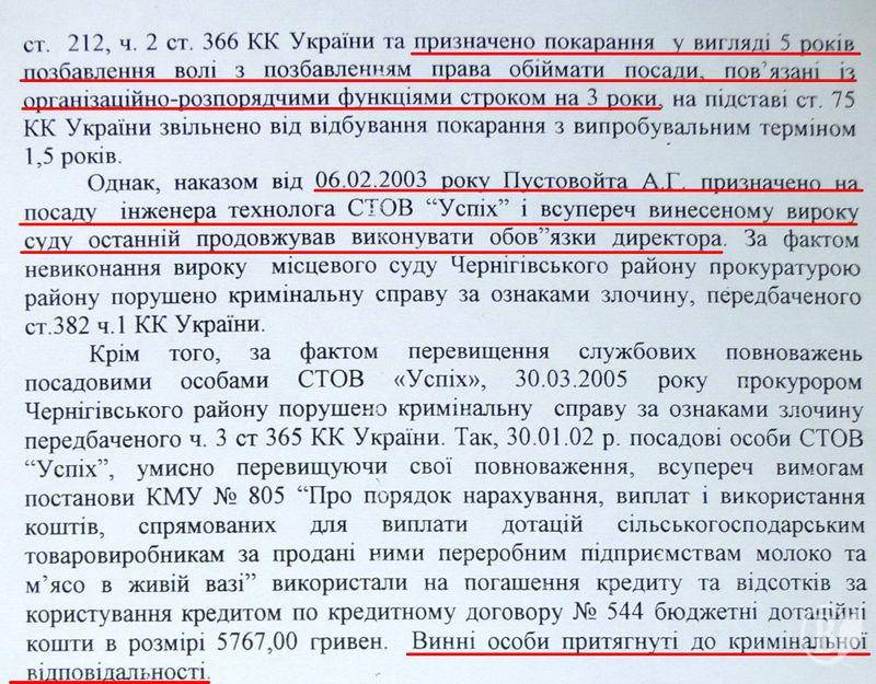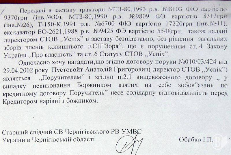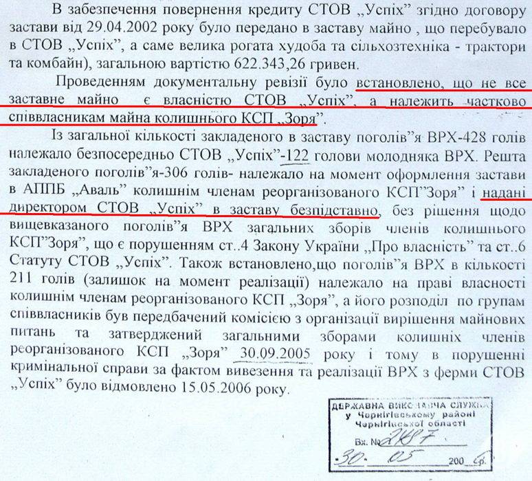 1. В статі неодноразово вказується, що корови було вивезено з території СТОВ «Успіх» та із корівників СТОВ «Успіх». Хочу Вам повідомити наступне, СТОВ «Успіх» не має ні корівників, ні території, взагалі нічого. Приїхав до нас Пустовойт А.Г., зареєстрував СТОВ «Успіх». Ніякого майна у нього не було. Ми надали СТОВ «Успіх» в оренду паї. А Пустовойт, мало того, що спустив все, так ще й набрав під пайове майно кредитів.