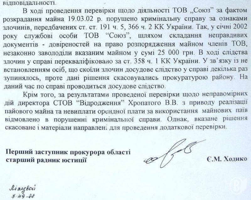 6. «Кримінальну справу прокуратура відкрити відмовилися, як часто в нас буває міліція передає прокуратурі, а прокуратура міліції... У результаті обставини вивезення арештованого майна не встановлені і досі». Всі обставини встановлено. Винну сторону знайдено, це СТОВ «Успіх». Не треба читачів вводити в оману.