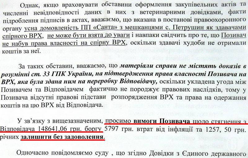 5. «Важливо те, що за усною домовленістю з селянами ПП «Санта» мав повернути їм гроші за передану йому ВРХ лише після розрахунків «Ритму». І це замість того, щоб взяти товар і одразу розрахуватися за нього з селянами. Хоча в принципі такі «відстрочки платежу» і дозволені законодавством, але питання права «Санти» торгувати петрушинською худобою залишається сумнівним.» Шановний автор навіть виражає сумнів в законодавстві України. Він пише що законодавство дозволяє, але тут же виражає сумнів. Тобто сумнів автора вище закону України. Буває.