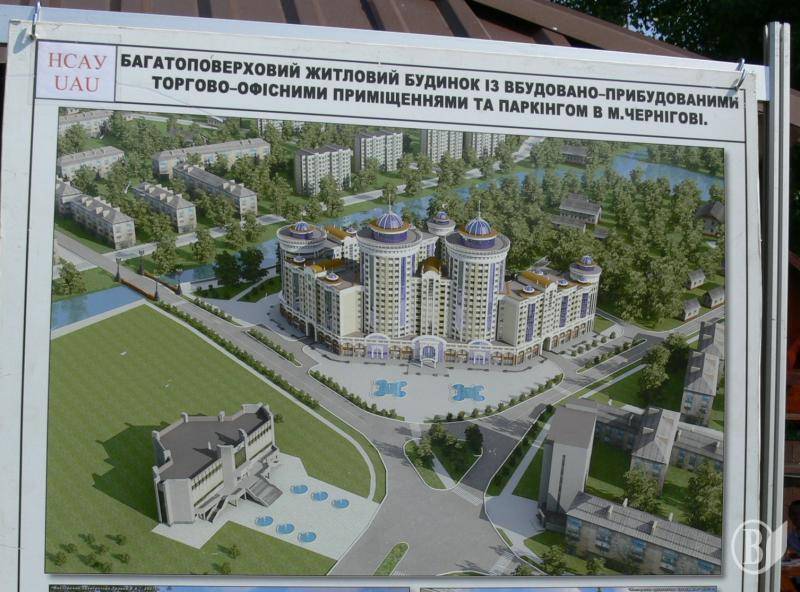 Причём, не только расширяют русло, но и окапывают технику, видимо чтоб не грелась. Почему-то вспомнился сразу фотография стенда одной известной бизнес-структуры, которая представляла его как вариант развития Чернигова на встрече «20 самых известных и влиятельных людей региона». Название стенда гласило: многоэтажное жилое здание со встроено-пристроенным торгово-офисным помещением и паркингом в г.Чернигов. Находилось это спасительное и развивающее для города строение как раз на территории (о, какая неожиданность!) Марьиной рощи.