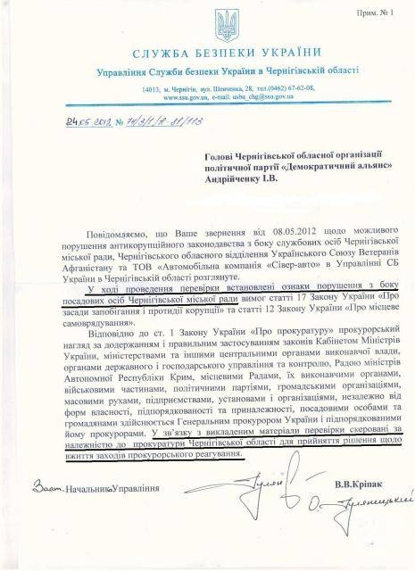 У відповіді Управління СБУ в Чернігівської області йдеться про те, що у фактах отримання двох Тойот міською радою встановлено ознаки таких злочинів з боку посадових осіб Чернігівської міської ради:
