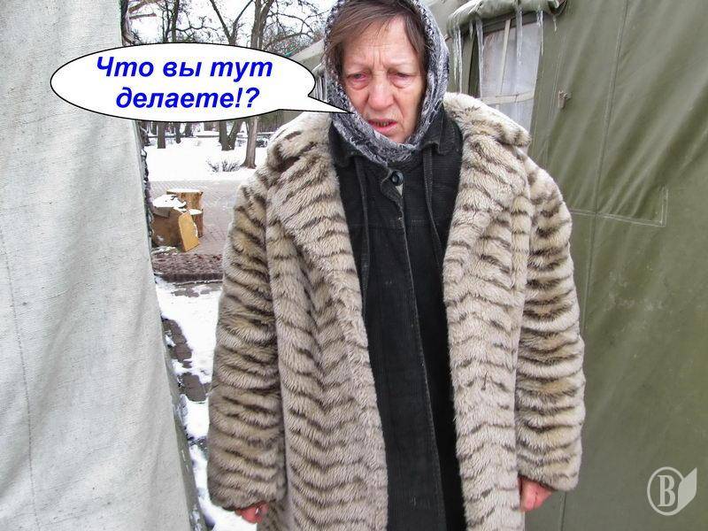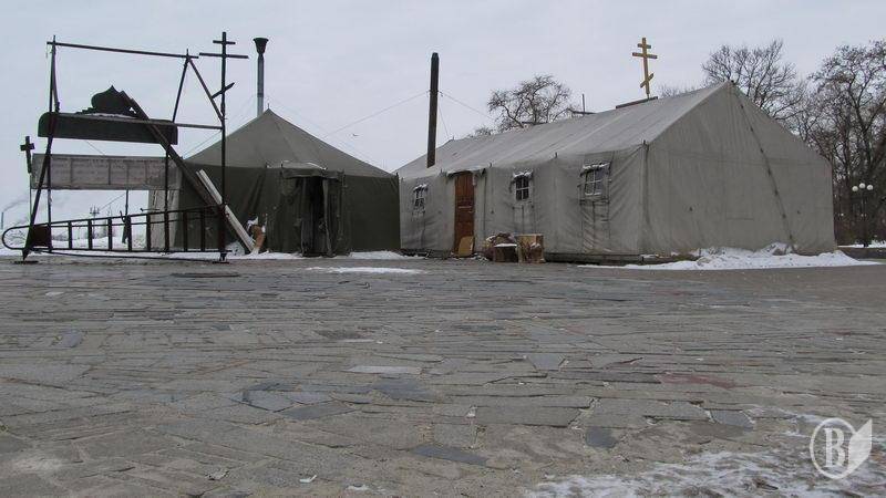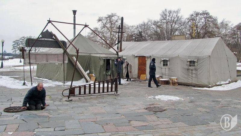 Сьогодні вже 12 березня. Півмісяця «прострочено». Намети й нині там. Та ще й, як видно на цьому фото, виходить з незаконних «віг-вамів» не аби хто, а… наша міліція, котра нас начебто береже. На виході шапки одягають. Незрозуміло, що в отих «малих архітектурних формах» робив міліцейський патруль з кийками на поясі й непокритими головами? Невже, молилися?