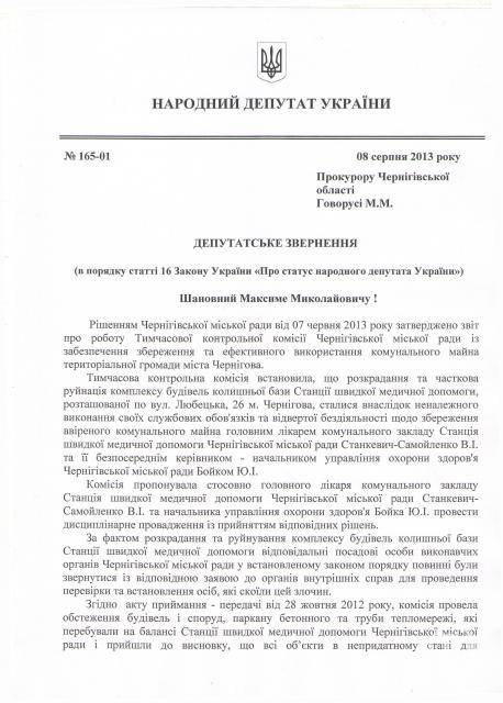 - Дев’ятого липня я надіслав запит Чернігівському міському голові Олександру Соколову, де просив відповісти на питання: як виконуються пропозиції комісії. Вже 15 липня Олександр Соколов у відповіді повідомив, що головного лікаря Вероніку Станкевич-Самойленко звільнено із займаної посади, а начальник управління охорони здоров’я Чернігівської міської ради Юрій Бойко отримав суворе попередження про недопущення в подальшому виникнення подібних ситуацій. Також у листі зазначено, що органи внутрішніх справ були поінформовані про факти руйнації приміщення станції швидкої медичної допомоги невідомими особами, — коментує Валерій Дубіль. — Водночас Чернігівський міський відділ УМВС України та прокурор міста на мій запит щодо поінформованості у цій справі відповіли: мовляв, жодних заяв від відповідальних осіб Чернігівської міської ради про факт розкрадання комплексу будівель колишньої бази Станції швидкої медичної допомоги, розташованої на вул. Любецька, 26 м. Чернігова, до них не надходило.