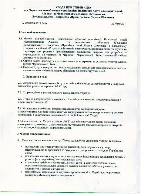 Дві організації ставлять за мету налагодити співробітництво у розвитку громадянського суспільства на Чернігівщині - зокрема, в Угоді йде мова про участь у розвитку територіальних громад області, формування та реалізації концепції «Міста, дружнього до людей».