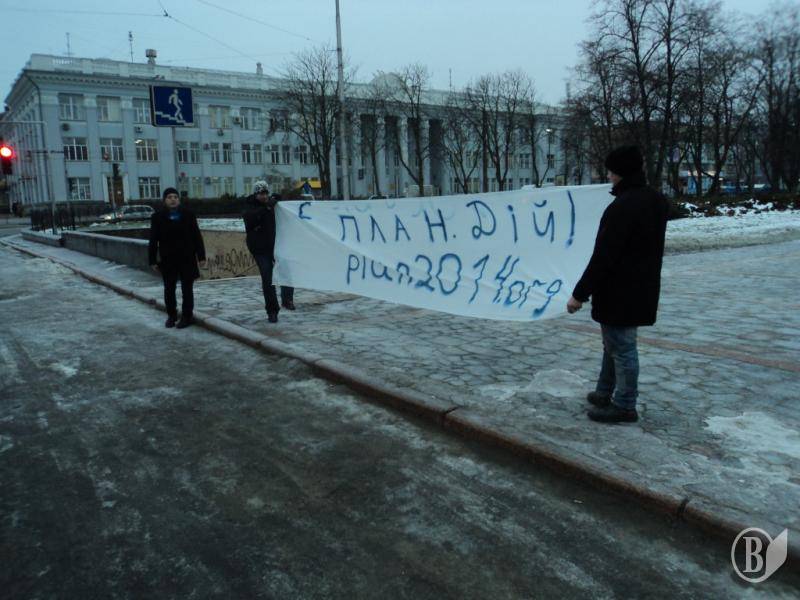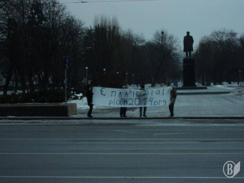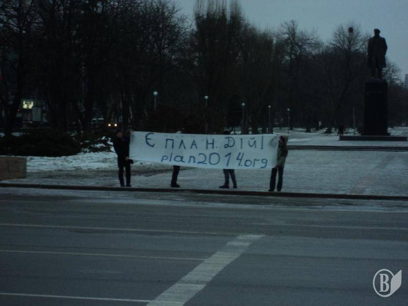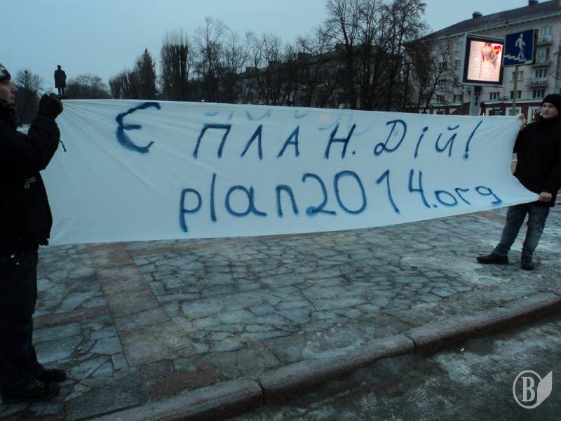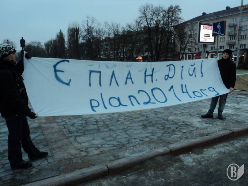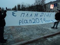 Декілька активістів Демократичного Альянсу тримало плакат «Є план. Дій! Plan2014.org».