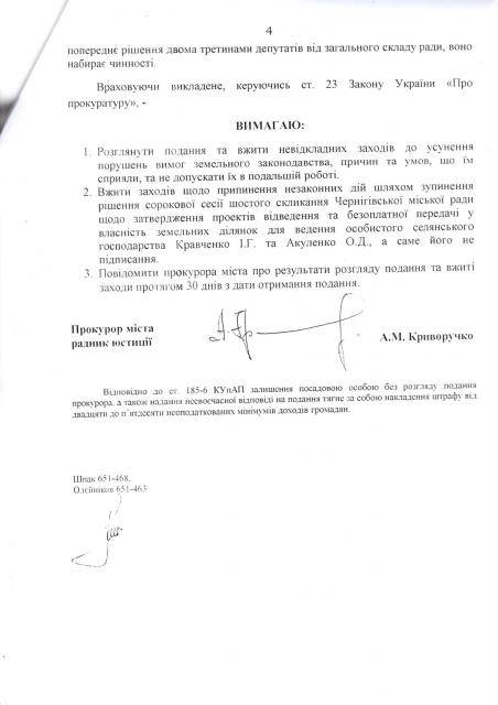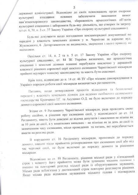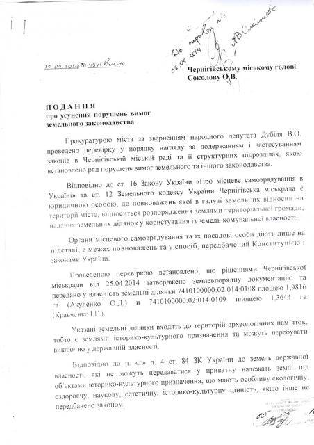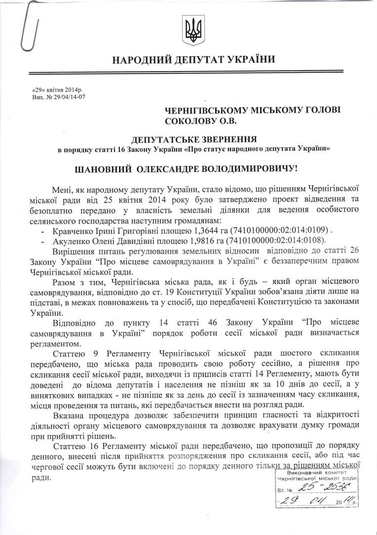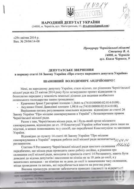 За словами народного депутата, щойно йому стало відомо про безоплатну передачу у власність земельних ділянок для ведення особистого селянського господарства громадянам Кравченко Ірині Григорівні площею 1,3644 га та Акуленко Олені Давидівні площею 1,9816 га - він надіслав звернення до Чернігівського міського голови Олександра Соколова та прокурора області Володимира Стеценка.