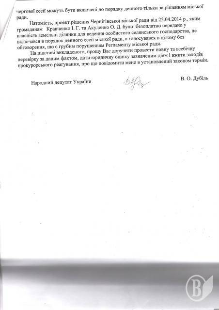 Прокуратура міста Чернігова за зверненням народного депутата України Валерія Дубіля перевірила як додержуються законодавства у Чернігівській міській раді і виявила факт порушення вимог земельного та іншого законодавств.