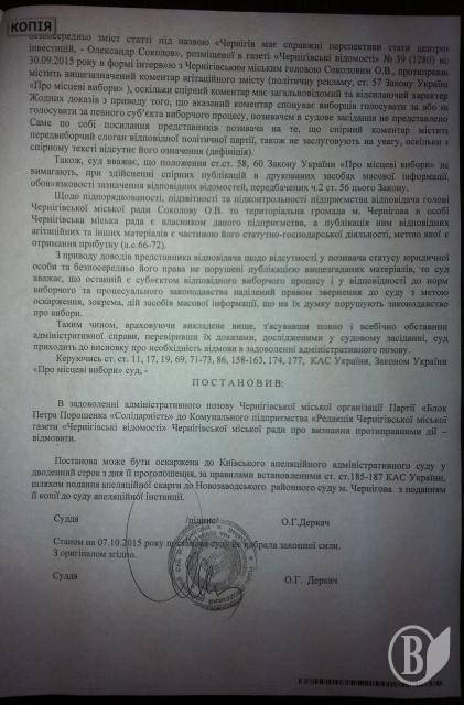 7 октября Новозаводской суд Чернигова отказал в иске Черниговской городской организации партии"Блок Петра Порошенко"Солидарность"к газете"Черниговские ведомости".