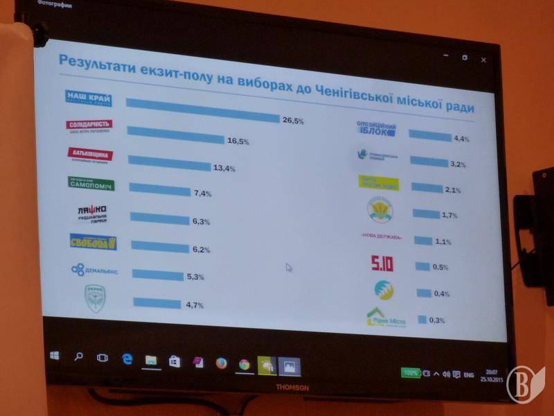 За результатами екзит-полу, у виборах до Чернігівської міської ради лідирує Чернігівська міська партійна організація політичної партії «НАШ КРАЙ», що набирає 26,5 %. За нею йде Чернігівська міська організація партії «БЛОК ПЕТРА ПОРОШЕНКА «СОЛІДАРНІСТЬ», що набирає 16,5 %.