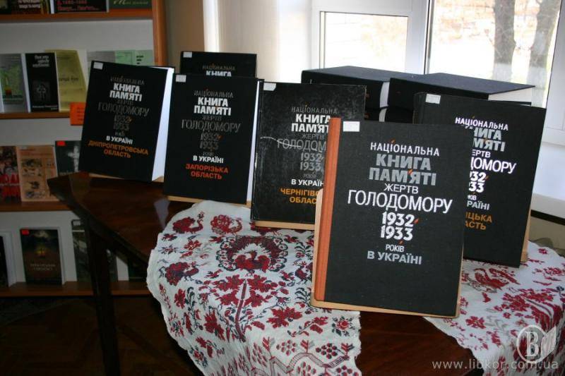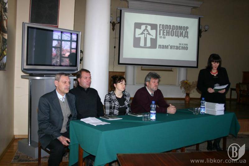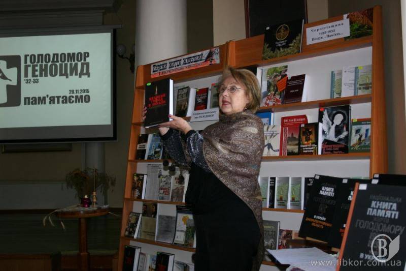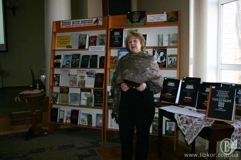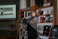 Вікторія СОЛОННІКОВА, співробітник краєзнавчого відділу Чернігівської обласної універсальної наукової бібліотеки імені В.Г. Короленка, презентувала книжкову виставку «Бережи життя живущий. Чернігівщина 1932–1933. Пошук… Пам’ять…», у якій представлені видані в Україні, і безпосередньо в області, книги, брошури, буклети, журнальні публікації про цю голодову катастрофу.