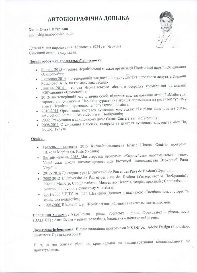 - ХОНІЧ Ольга Петрівна (Самопоміч), кандидат на посаду гуманітарного заступника міського голови;