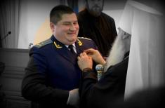 Громадянин Андрій Якович Полікопа вручає церковну відзнаку прокурору Чернігівської області Віктору Носенку