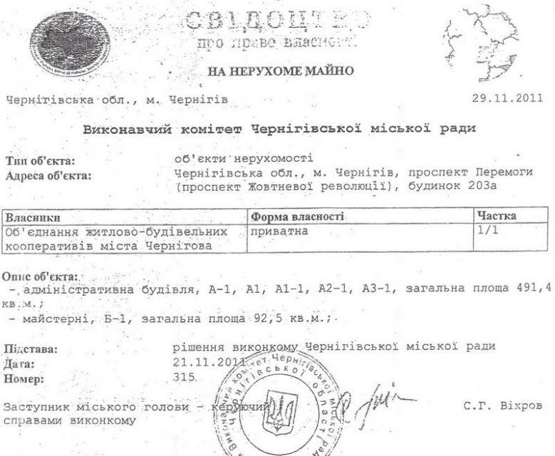 У меня есть копии документов, по которым исполком Черниговского городского совета дал разрешение на оформление недвижимого кооперативного (общего) имущества (административное здание площадью 491,4 кв. м и мастерская площадью 92,5 кв. м). в частную собственность. Подпись заместителя городского головы-руководителя делами исполкома С. Г. Вихрова.
