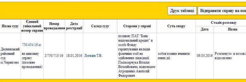 Деснянський райсуд рішенням від 9 березня у справі №750/454/16-ц відмовив у задоволенні позову ПАТ «Банк Національний кредит» в особі уповноваженого від ФГВФО на здійснення ліквідації Віталія Паламарчука до декого «ОСОБА2» про зобов'язання повернути гроші в сумі 125362,81 доларів США.