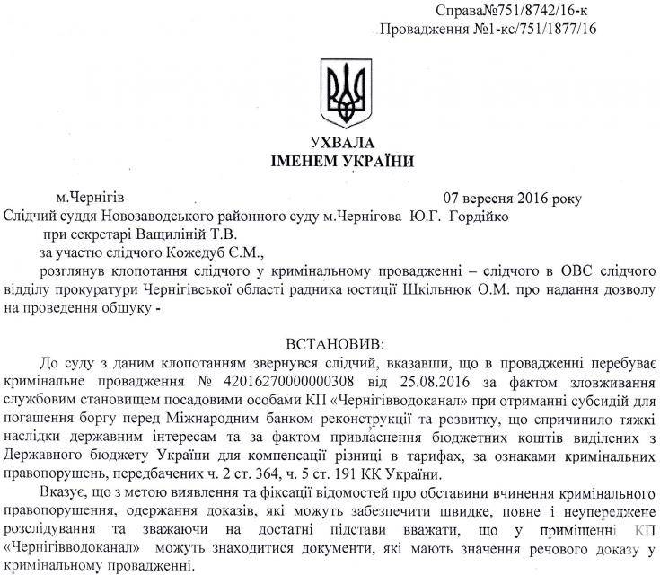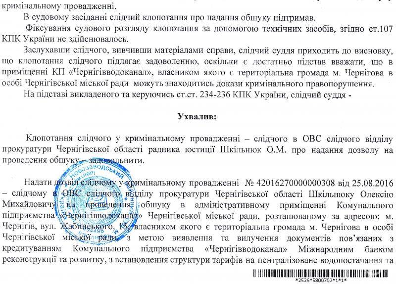 Метою обшуку було: виявлення та вилучення документів, пов’язаних з кредитуванням КП «Чернігівводоканал» Міжнародним банком реконструкції та розвитку, та з встановленням тарифів на централізоване водопостачання та водовідведення на 2014-2015 роки, чорнові записи, електронні носії, комп’ютерна техніка за допомогою якої було скоєне кримінальне правопорушення.