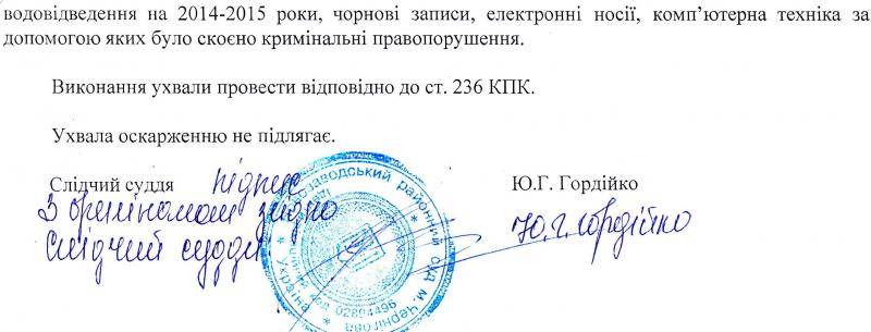 В результаті, слідчим відділу прокуратури Чернігівської області радником юстиції Шкільнюк О.М. було вилучено декілька десятків томів бухгалтерських документів без жодного їх опису, а також комп’ютер визначений слідчим особисто, поза межами документів зазначених в ухвалі суду.