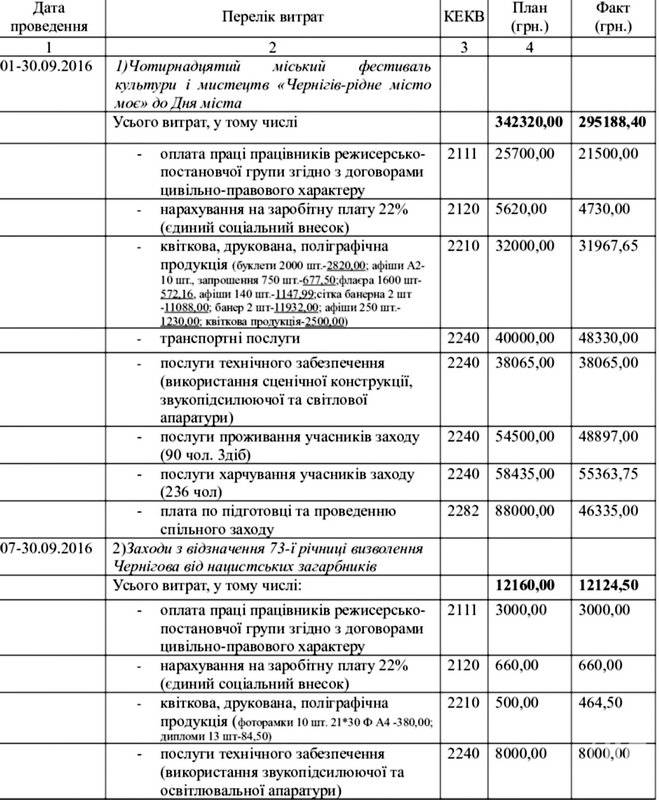 Пресс-служба Черниговского городского совета предоставляет исполнительную смету расходов по Управлению культуры и туризма горсовета на проведение городских праздничных мероприятий в сентябре.