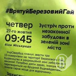 «УкрСиверБуд планирует строить три 10-этажки на территории Березовой рощи. Строительство в рекреационной зоне запрещено законом! Нужно действовать прямо сейчас, иначе парк превратится в грязную стройплощадку, исчезнет красивое место для отдыха», - сказано в объявлении.