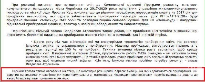 Але, дивлячись на затверджену 15 квітня виконкомом Схему санітарного очищення міста, де передбачене утримання в зимовий період усієї міської вулично-дорожньої мережі комунальним підприємством АТП-2528 і так само, дивлячись на цільову Програму розвитку ЖКГ міста Чернігова на 2017-2020 роки, де немає розділення міської вулично-дорожньої мережі на «приватносекторну» і «неприватносекторну», здається, що хтось хоче надурити мешканців приватного сектору міста. Це як мінімум, а як максимум – ще й роздеребанити бюджетні кошти під «сніжний шумок».