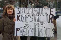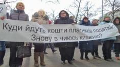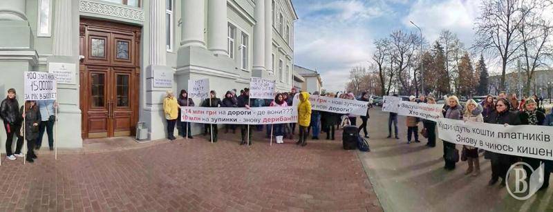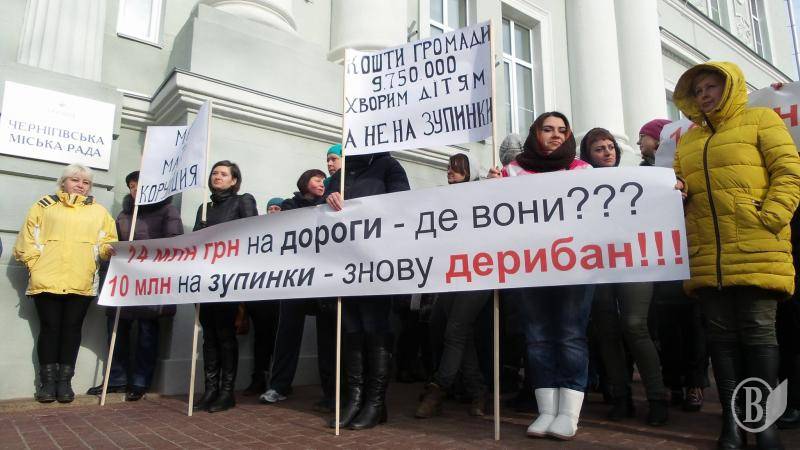 Перед будівлею Чернігівської міської ради зібралися підприємці та їхні робітники, аби протестувати проти так званої уніфікації зупинок громадського транспорту і виділення на це понад 9 мільйонів з бюджету міста.