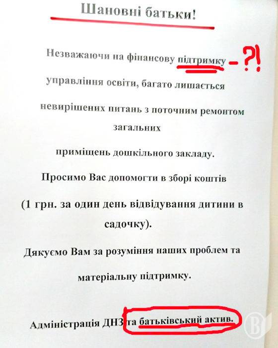 «В садике N заведующая сказала: "Посмотрим,как не будут собирать!". А наказывают,в первую очередь, воспитателей, которые "не умеют правильно доносить информацию родителям". Вот было у нас собрание, сказали воспитатели, что им выделили частично, что на мыльные хватает, а на туалетную бумагу – нет, поэтому по 20 грн в месяц с нас все равно качают. И ещё одно новшество: гривна за день пребывания в садике. Это ж как надо извращаться, что б такое придумать!».