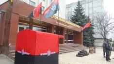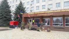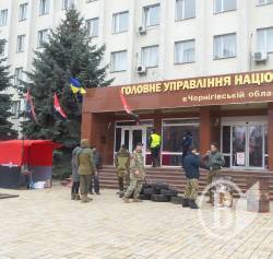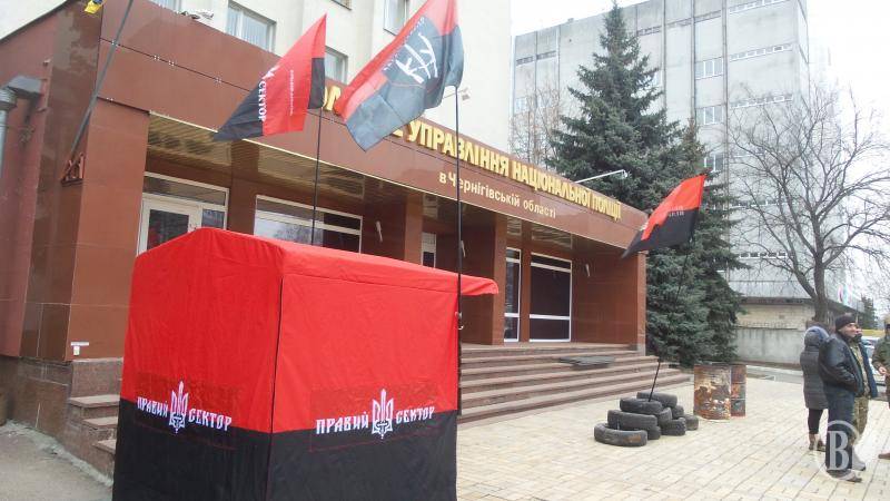 Активісти з символікою «Правого сектору» встановили намет перед приміщенням головного управління Національної поліції України в Чернігівській області на проспекті Перемоги в Чернігові.