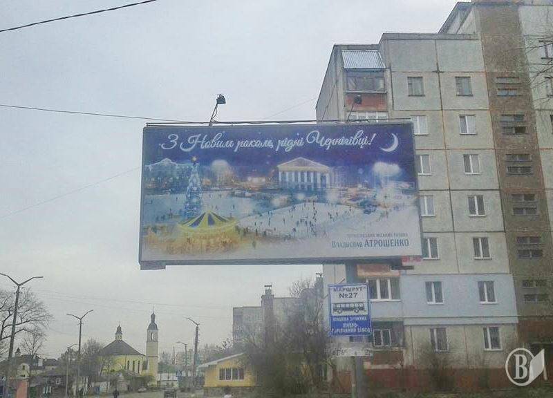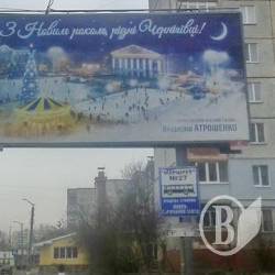 Привітання від імені Владислава Атрошенка з Новим роком на адресу чернігівців розміщено на великому рекламному щиті на вулиці Гонча.