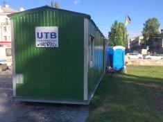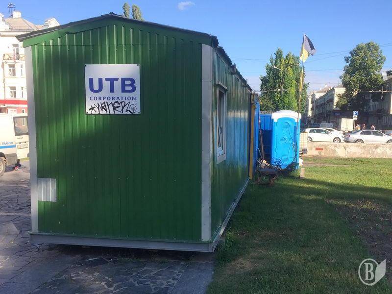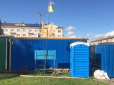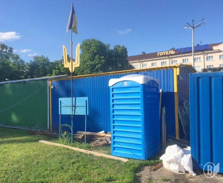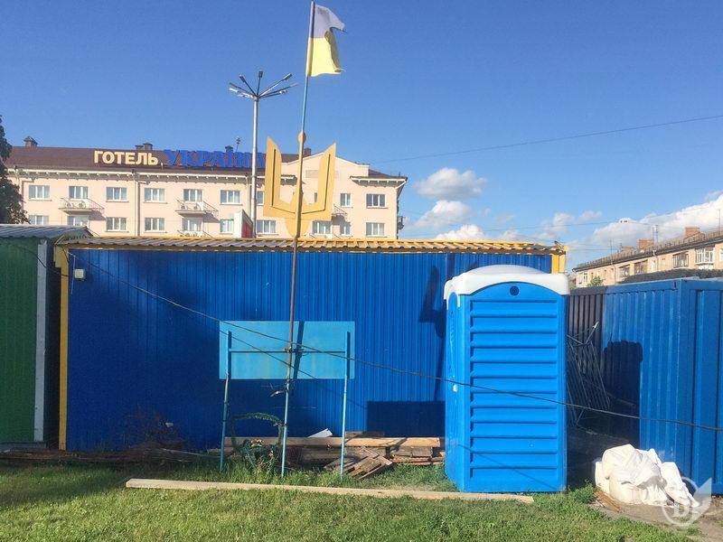 Поряд з цим пам’ятним знаком, менш за метр від нього, розташований вагончик компанії «Укртрансбуд» та… біотуалет.