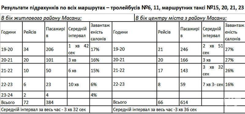 Результати підрахунків по всіх маршрутах – тролейбусів №6, 11, маршрутних таксі №15, 20, 21, 23 – в другій таблиці.