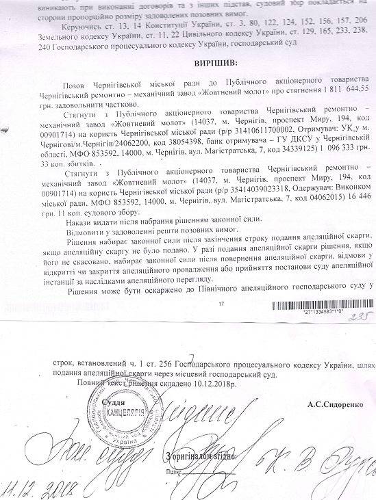 Судова справа № 927/369/18за Позивом Чернігівської міської ради до ПАТ ЧРМЗ «Жовтневий молот» - «Про стягнення 1 811 644 грн. 55 коп. збитків (упущеної вигоди)….»