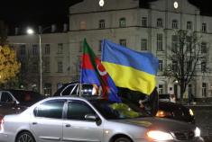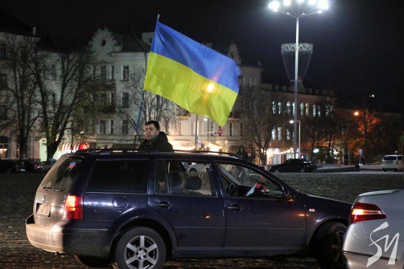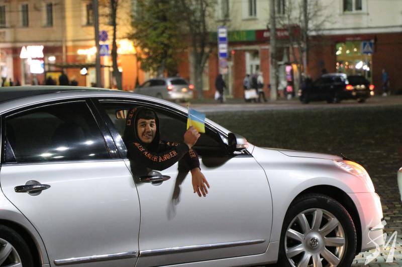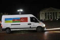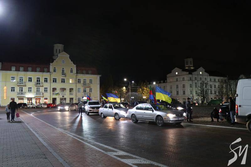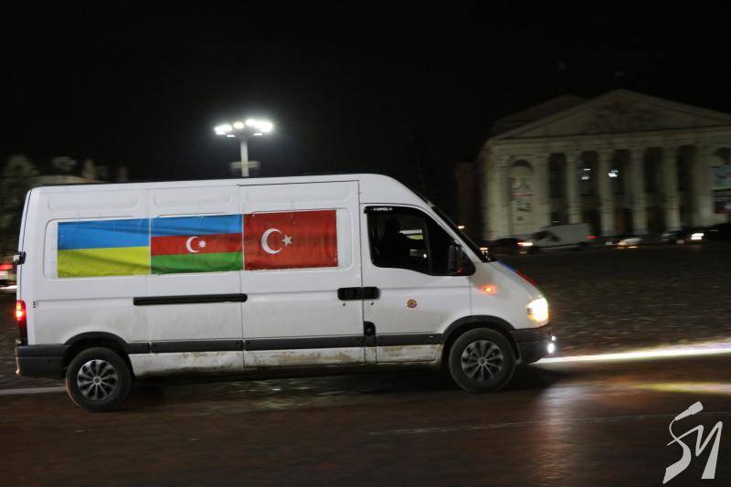 Близько двадцяти машин об’їхали коло на площі і зупинилися біля пам’ятних знаків загиблим захисникам України і вигукували «Слава Україні!», «Слава Азербайджану!».