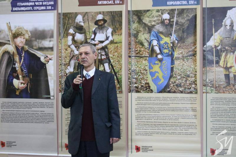 «Українська армія гідно протистоїть агресору, спираючись на потужну народну підтримку та славні бойові традиції, що формувалися впродовж багатьох минулих століть. Воїни Русі тисячу років тому прогриміли на всю Європу успішними походами на Візантію та розгромом Хазарського каганату. В часи Великого князівства Литовського та Речі Посполитої особливо славилися своїми бойовими якостями волинські та подільські корогви. А з утворенням козацького стану постав новий тип воїна – універсального, витривалого, готового до швидкої зміни обстановки. Не дарма козацьку піхоту вважають чи не найкращою в Східній Європі. А з десяти лівобережних полків три розташовувалися в нашому регіоні – Чернігівський, Ніжинський та Прилуцький», — наголосив Сергій ГОРОБЕЦЬ, кандидат історичних наук, представник Українського інституту національної пам’яті, презентуючи частину виставки, присвячену українському війську часів середньовіччя.
