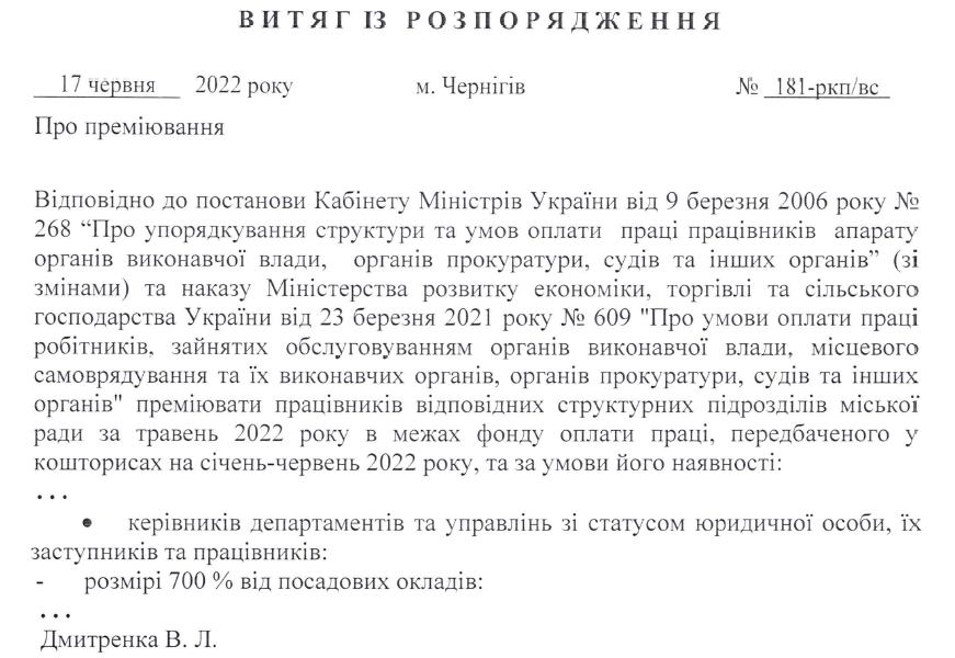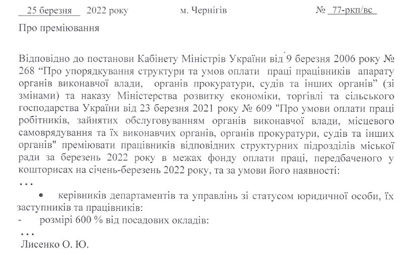 Ці слова Владислава Атрошенка зацікавили чернігівського правозахисника та помічника депутатки міськради Марини Рейко Олександра Гашпара. Він надіслав запити до міської ради та отримав копії розпоряджень міського голови про преміювання керівників структурних підрозділів за увесь минулий рік.