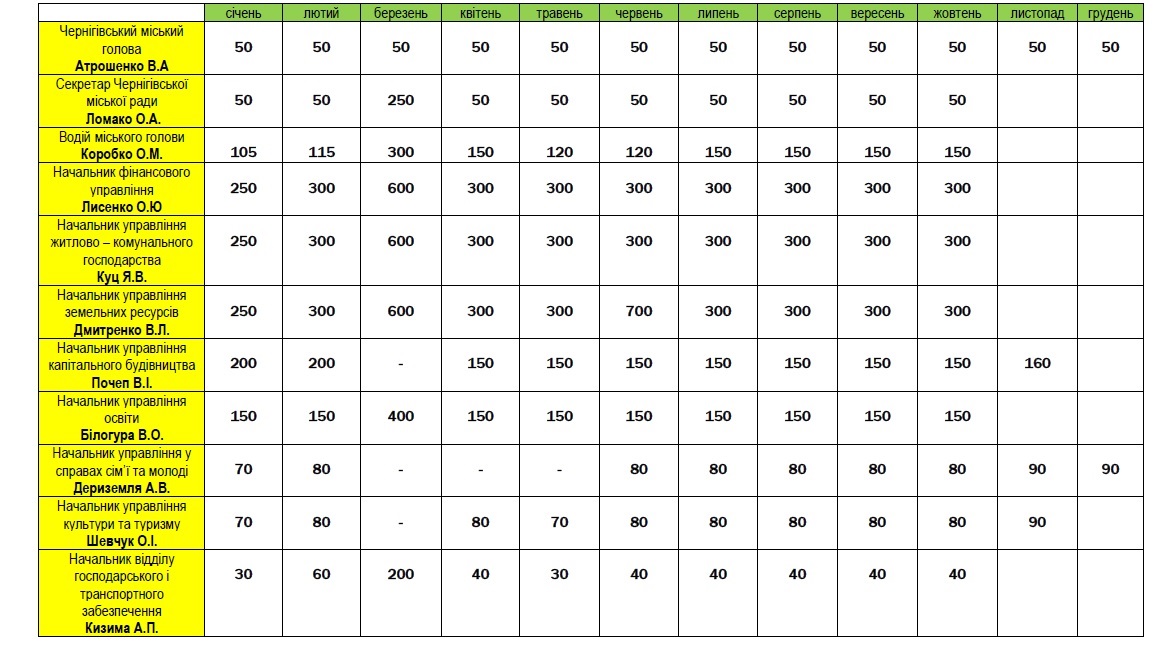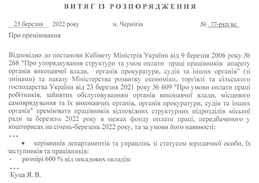 Найбільше грошей, окрім очільника управління земельних ресурсів, керівники структурних підрозділів Чернігівської міської ради отримали у березні. Протягом цього місяця Чернігів перебував у блокаді. Премії у 600% (це 38 тисяч 100 гривень) отримали начальник управління ЖКГ Ярослав Куц, начальник управління земельних ресурсів Василь Дмитренко та керівниця управління фінансів Олена Лисенко.