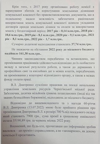 Якщо коротко, Дмитренко отримав премію за "сумлінну працю на посаді керівника управління земельних ресурсів". У відповіді йдеться, що, завдяки системній роботі із землекористувачами, за п'ять років він зумів збільшити надходження до міського бюджету (від податку на землю) на 84 мільйони гривень. З планових 165 мільйонів у 2017 році до фактичних 249 мільйонів у 2021-му. Крім того, Дмитренко організував роботу комісії з нарахування збитків за користування комунальною землею без належно оформлених документів. За шість років додаткові надходження від роботи цієї комісії склали майже 38 мільйонів. А у воєнному 2022 році у бюджет міста надійшло 161 мільйон гривень.