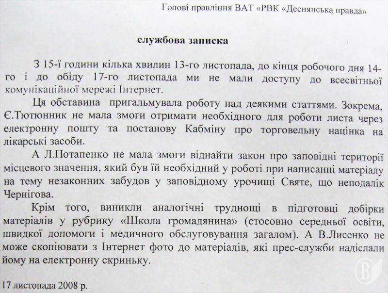Служебная записка на имя председателя правления ОАО «РВК «Деснянская правда», структурным подразделением которого является газета, - не имела ответа. Он то ли пошёл в отпуск, то ли поехал в санаторий, поэтому никак не отреагировал на этот сигнал.