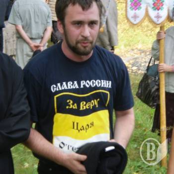 На фото: Жукля. 13 сентября 2009 года. В футболке с вот такой надписью приехал «воевать» со сторонниками Киевского патриархата этот юнец. В Чернигове он, обычно, ходит в подряснике, потому что является студентом духовного училища УПЦ Московского патриархата