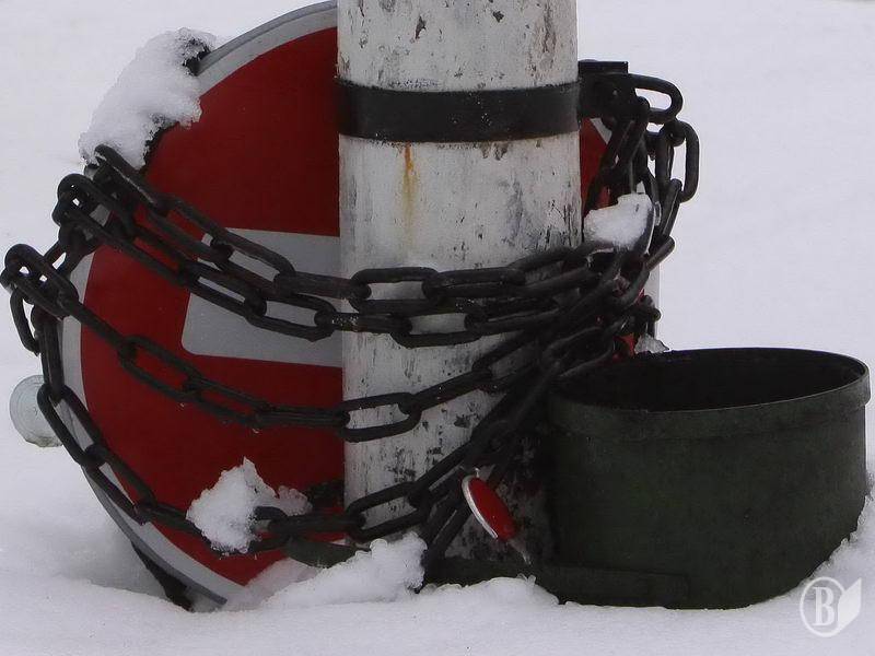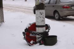 А от штрафи беруть справно. Чатують під кожним знаком, знають де «хлібні місця». Так от, повернемось до «цеглини». Раз знак пропадає, а він же на балансі, треба його прив’язати. І не просто прив’язали, а ще й ланцюгом прикували, прямісінько біля Носівської райдержадміністрації.