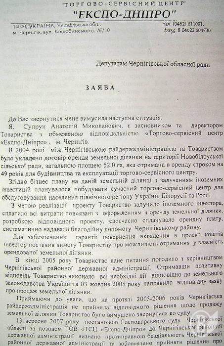 До Вас звернутися мене змусила наступна ситуація. Я, Супрун Анатолій Ми- колайович, є засновником та виконавчим директором товариства з обмеженою відповідальністю «Торгово-сервісний центр«Експо-Дніпро» м. Чернігів).