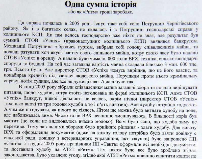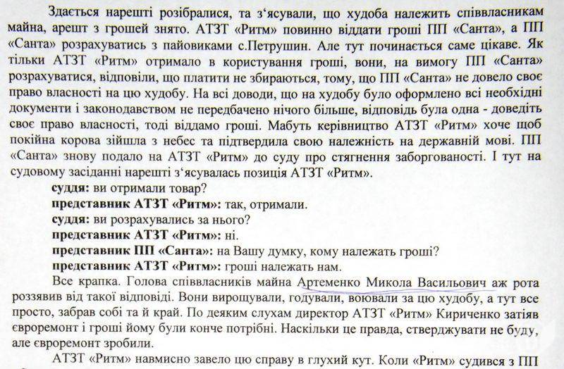 Важливо те, що за усною домовленістю з селянами ПП «Санта» мав повернути їм гроші за передану йому ВРХ лише після розрахунків «Ритму». І це замість того, щоб взяти товар і одразу розрахуватися за нього з селянами. Хоча в принципі такі «відстрочки платежу» і дозволені законодавством, але питання права «Санти» торгувати петрушинською худобою залишається сумнівним.