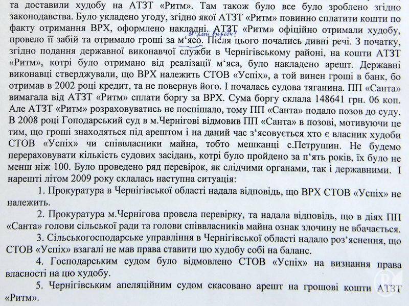 - сільськогогсподарське управління в Чернігівській обл. надало роз’яснення, що СТОВ «Успіх» вагалі не мало права ставити цю худобу собі на баланс;